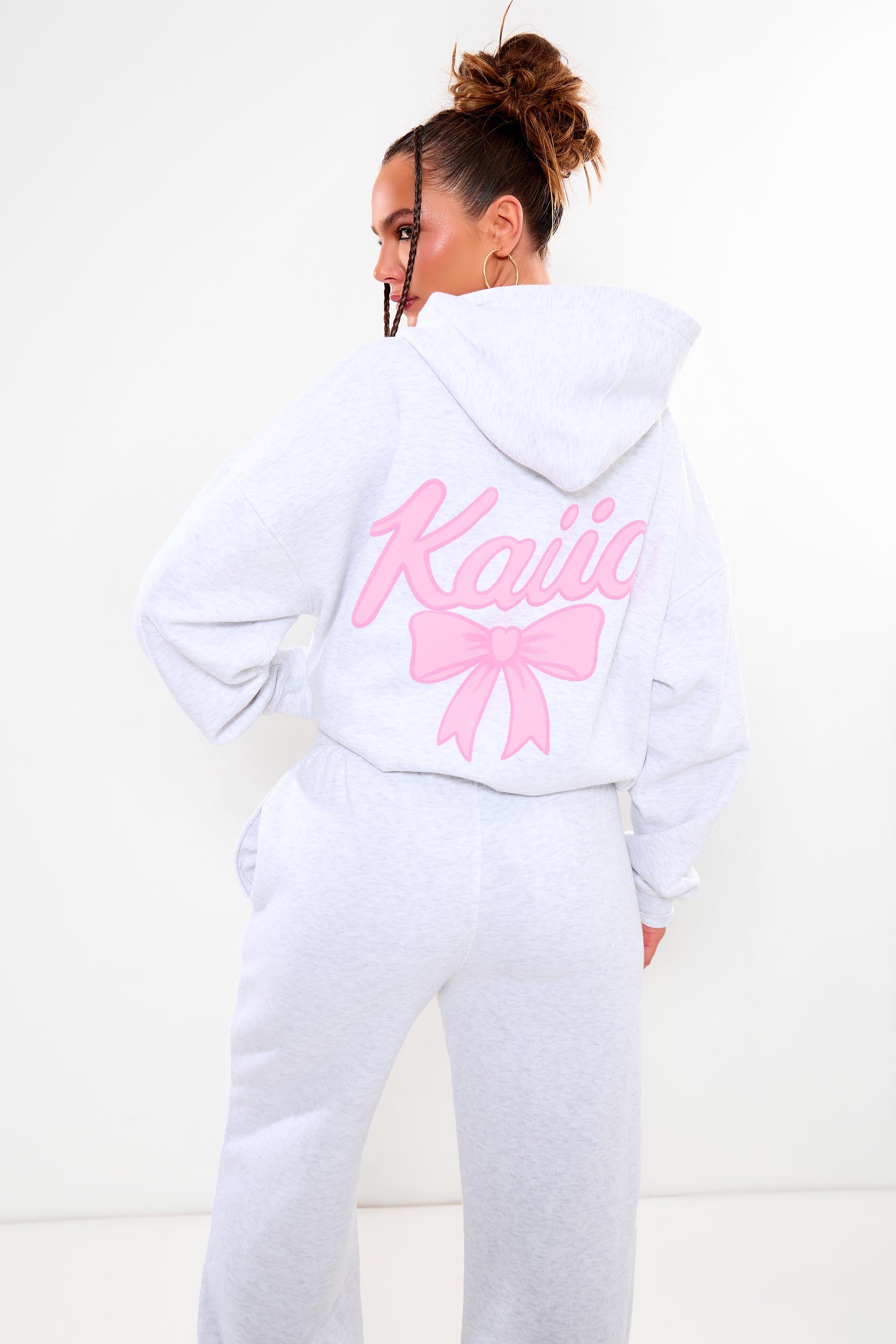 - Kaiia Bow Graphic Oversized Hoodie Light Grey Marl & Pink