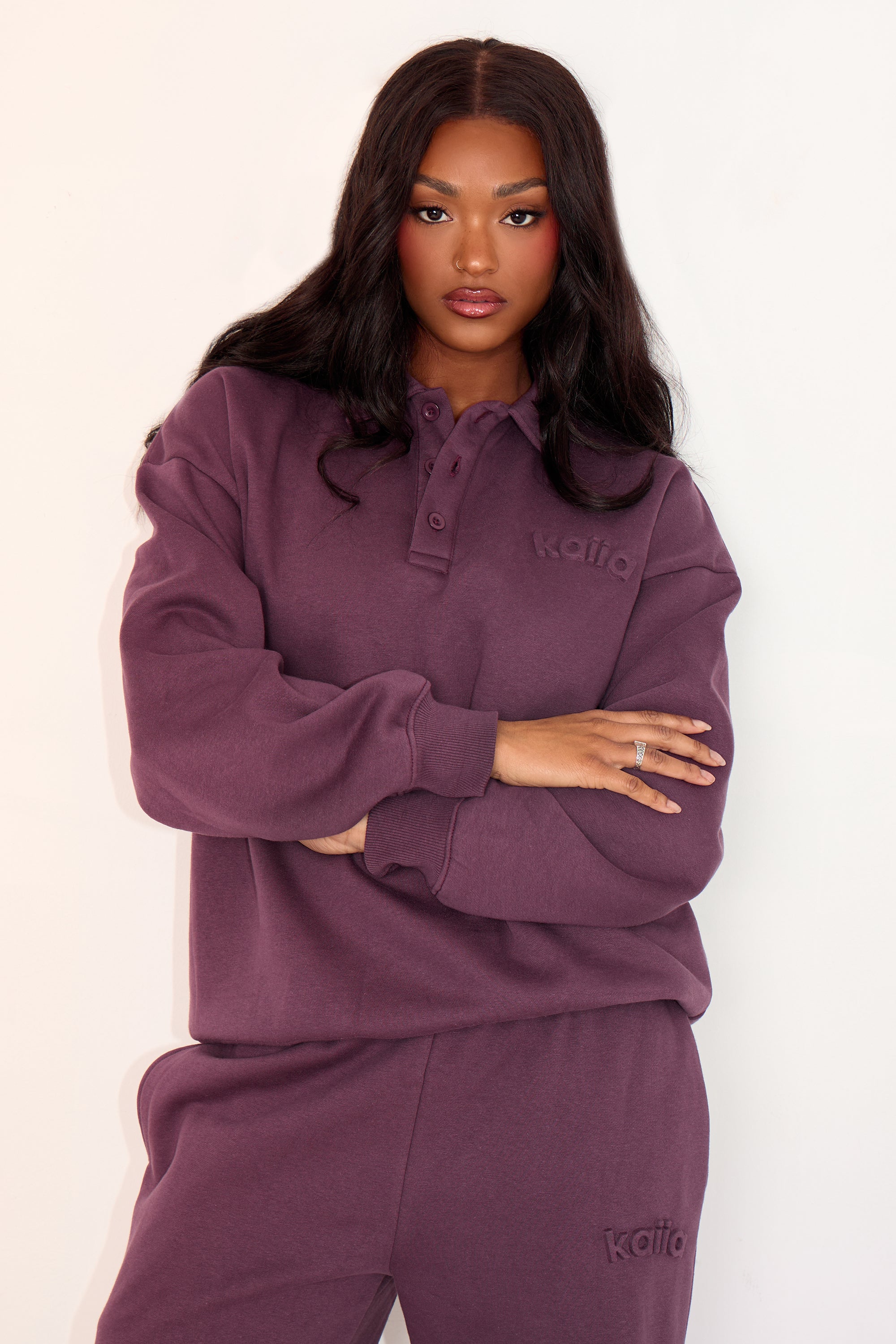 Kaiia Button Embossed Logo Polo Sweatshirt Aubergine