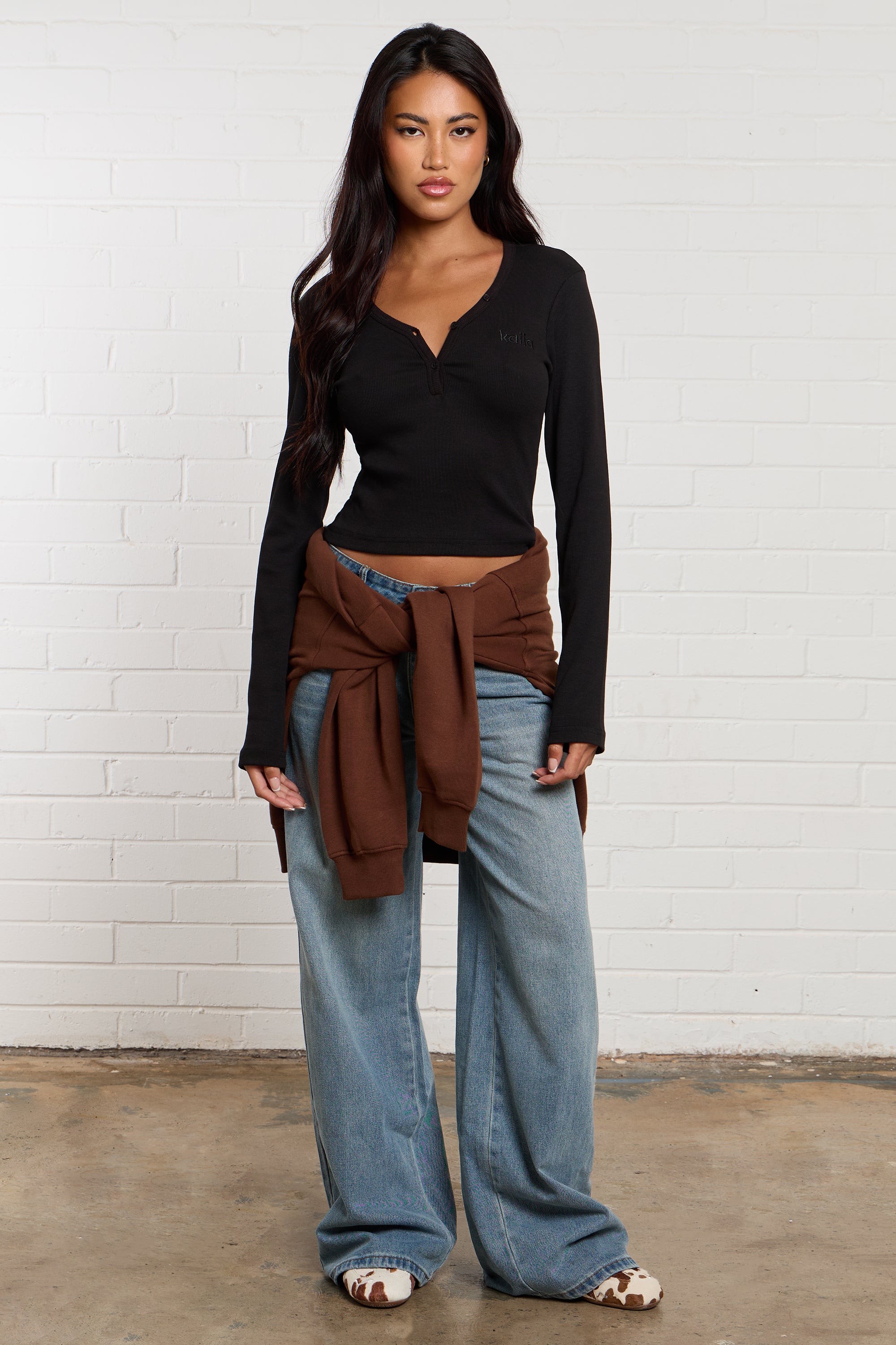 - Kaiia Ribbed Henley Long Sleeve Baby Tee Black