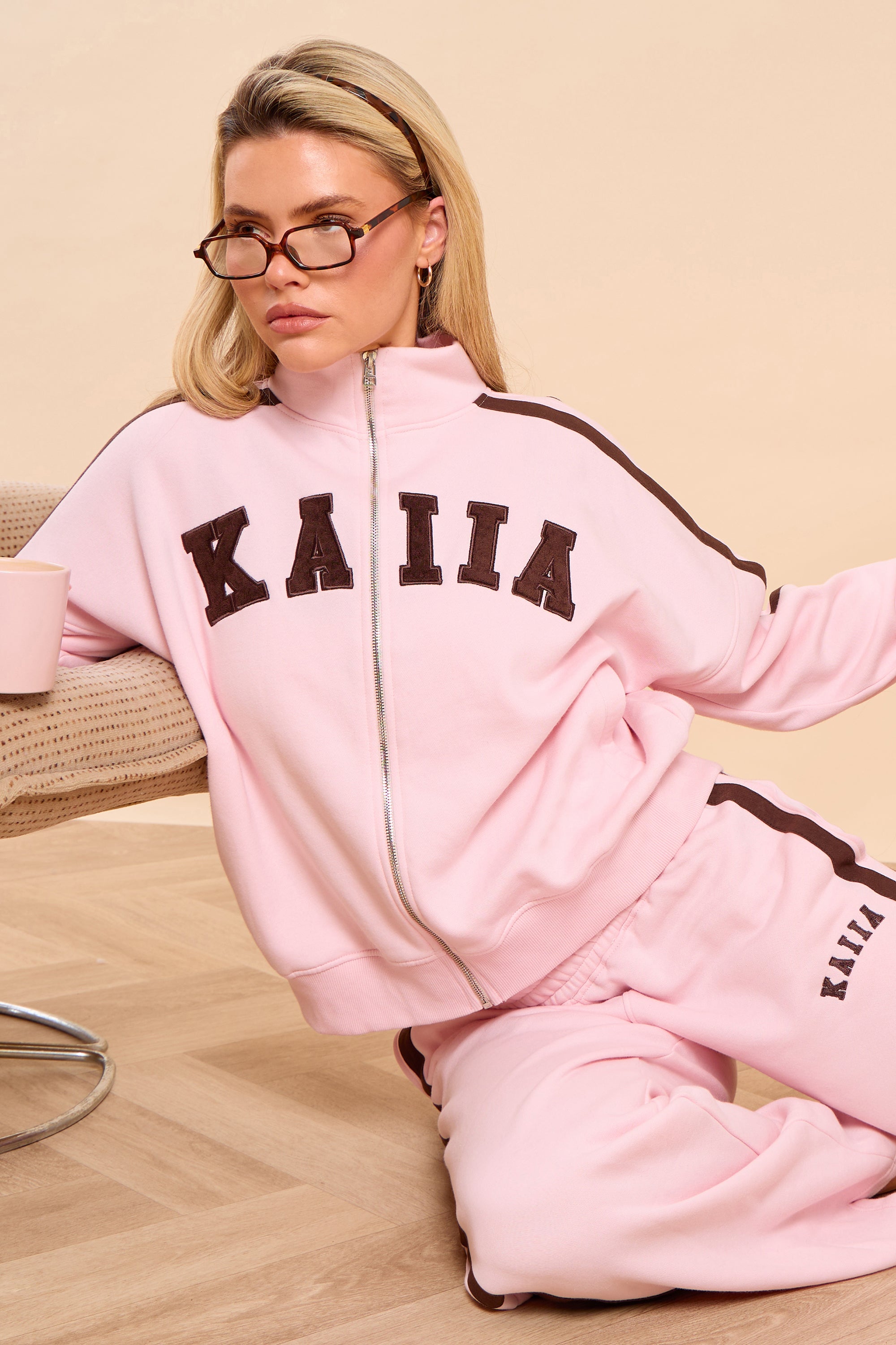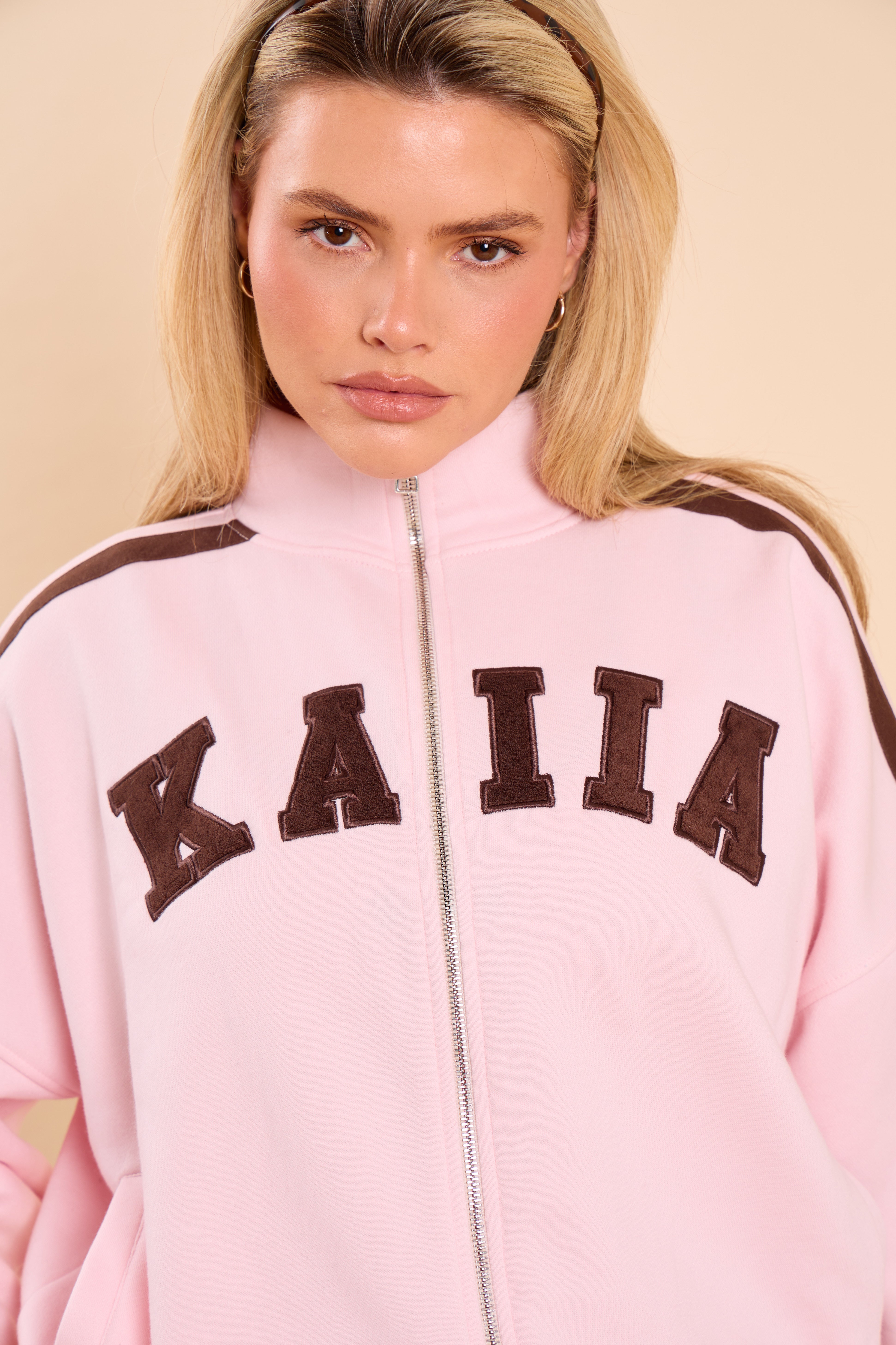 Kaiia Side Stripe Funnel Neck Zip Through Sweatshirt Pink Sugar & Espresso