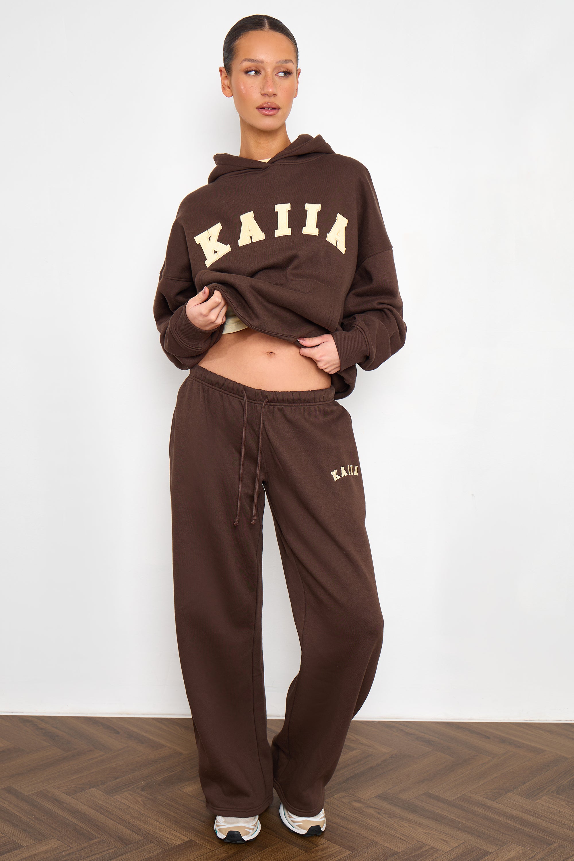 Kaiia Slogan Wide Leg Joggers Bitter Chocolate & Butter Yellow