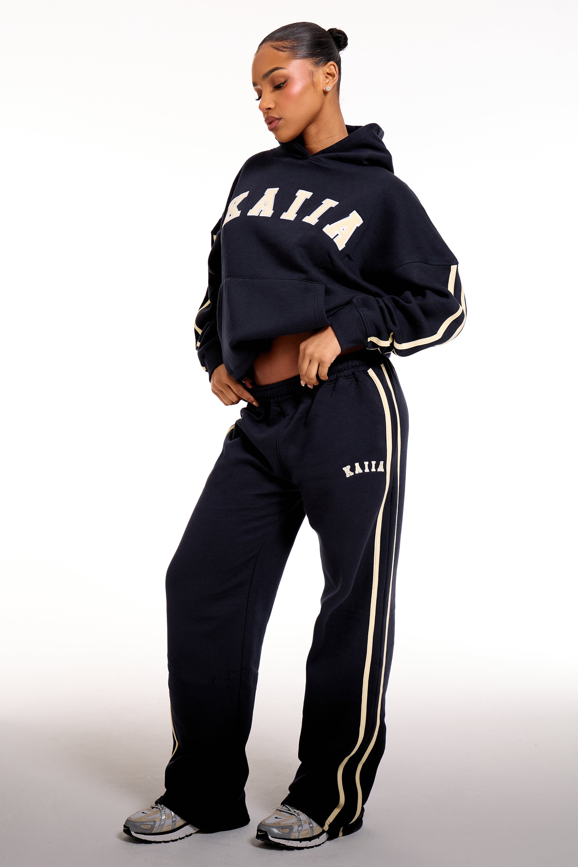 - Kaiia Sport Side Stripe Wide Leg Joggers Ink Blue & Soft Yellow