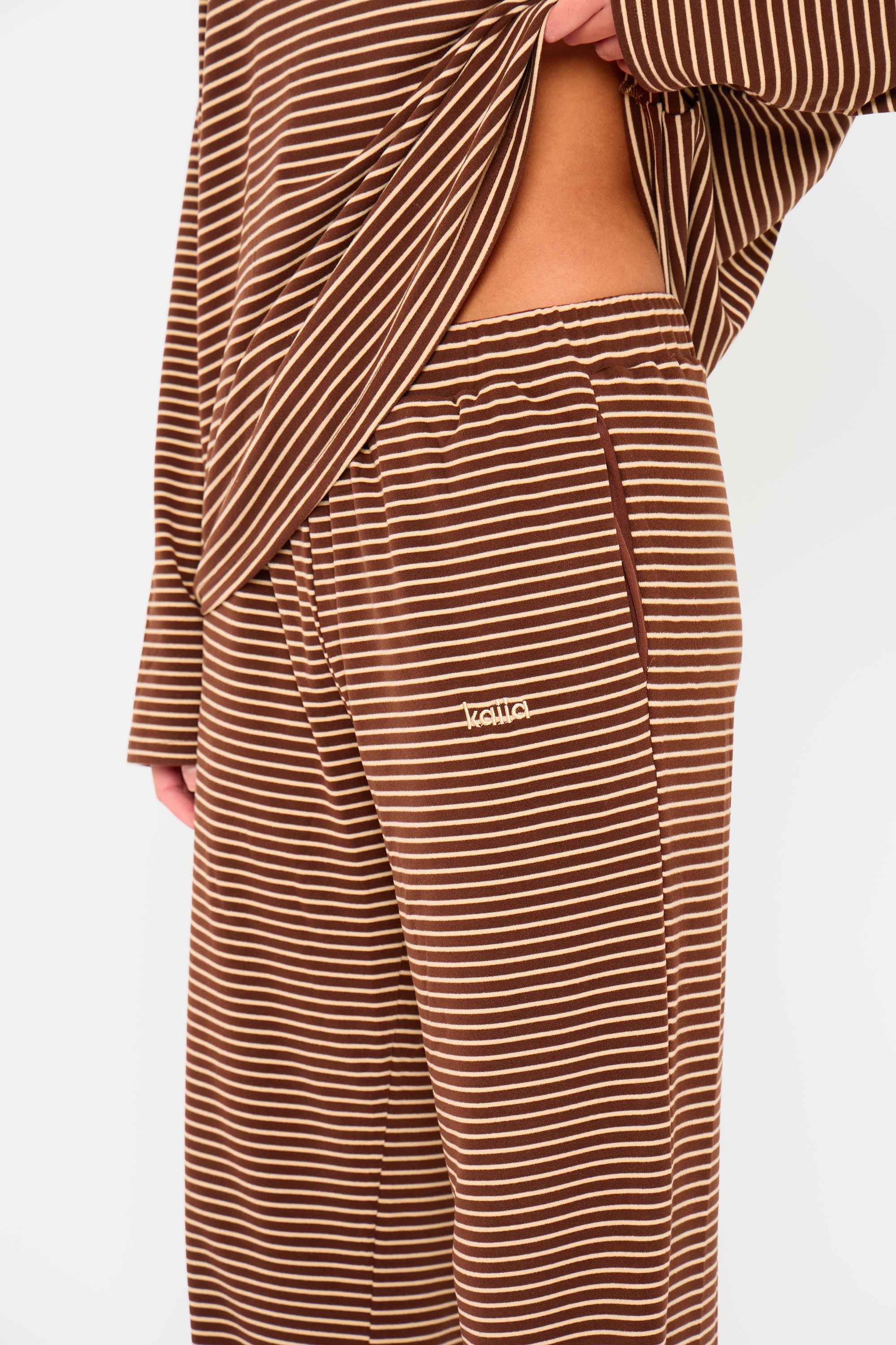 Kaiia Striped Fleece Drawstring Wide Leg Trousers Brown & Cream