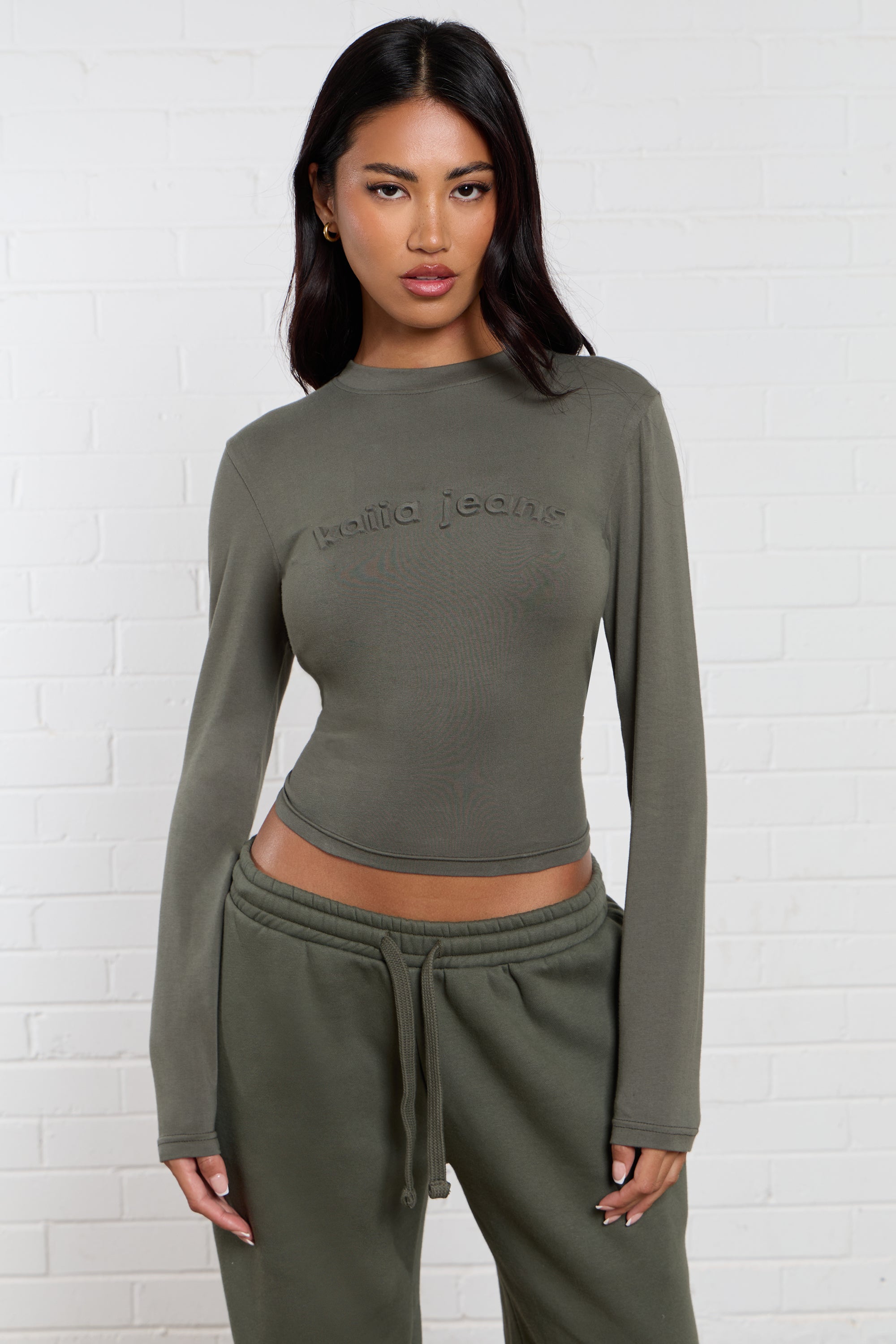 Kaiia Jeans Embossed Long Sleeve Baby Tee Smoke Olive